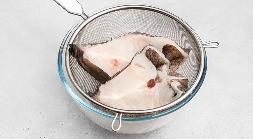 Для начала, желательно достать замороженные стейки зубатки. Их нужно аккуратно положить в сито и переместить в холодильник на 12 часов — это поможет правильно разморозить рыбу. Когда она будет готова, важно промокнуть её бумажными полотенцами, чтобы избавиться от лишней влаги.