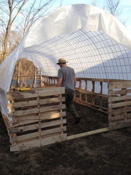 - Тоннели и палетные конструкции: Такие модели легко собираются из деревянных паллет и сетки, сверху накрываются пленкой или агротканью. Это бюджетное и практичное решение для винограда, томатов и других растений.