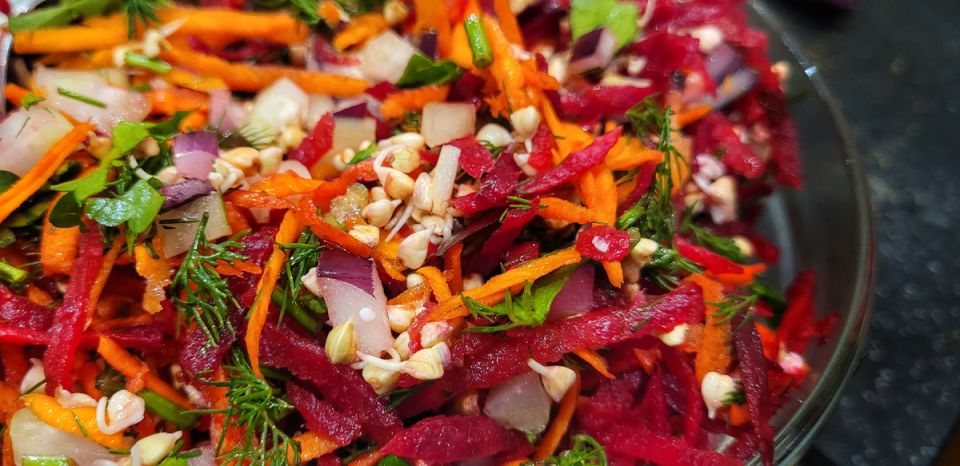 Для дальнейшего приготовления, стебелек сельдерея и красный лук нарезают мелкими кубиками. Свеклу и морковь можно натереть на корейской терке или порезать тонкой соломкой. Зелень, например, петрушку и укроп, также следует мелко нарубить. Затем все подготовленные ингредиенты объединяют в одной посуде, добавляют соль, заправляют маслом и лимонным соком.