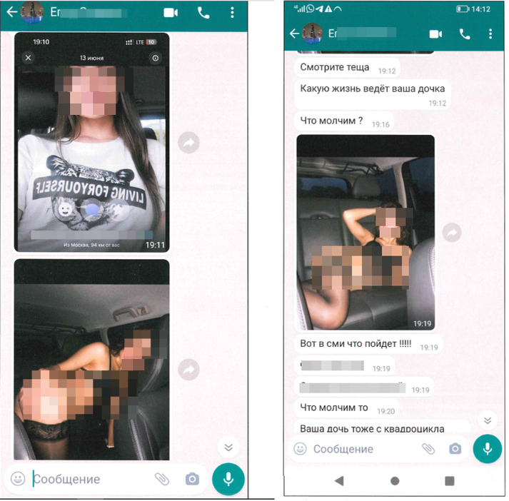 В 2014 году, во время отношений с Е., Ксюша запечатлела себя на фоне интимной обстановки. Эти фото, хранимые в недрах смартфона бывшего, внезапно вынырнули на поверхность в 2023 году после развода, принимая новую форму шантажа. Когда Ксюша попыталась привлечь внимание к ситуации, её мать получила сообщения с угрозами о рассылке этих снимков окружению Ксюши, если та решит обратиться к СМИ.