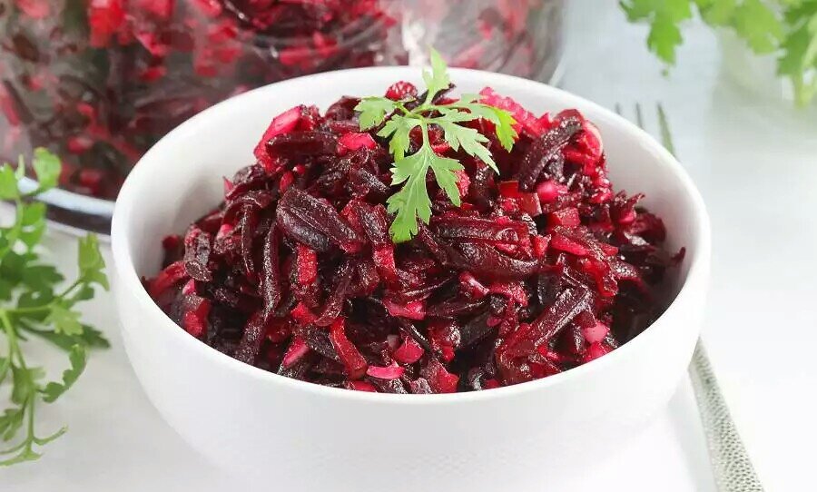 После обжарки лука, его следует удалить, а в масло добавить уксус и еще несколько щепоток приправ. Лук можно оставить, если вам хочется более яркого вкуса. Затем очищенную свеклу натереть и слегка обжарить в оставшемся масле, а после смешать все ингредиенты.