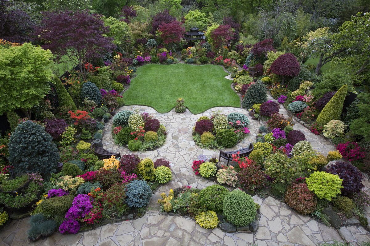 Сад разделен на верхнюю, среднюю и нижнюю зоны. Верхний участок украшен аккуратным газоном и кустарниковыми миксбордерами. Далее расположен средний и нижний уровни, где можно найти экзотические растения, ручьи и восточные элементы декора. Такой подход к дизайну создает захватывающие визуальные эффекты и впечатляющие композиции.