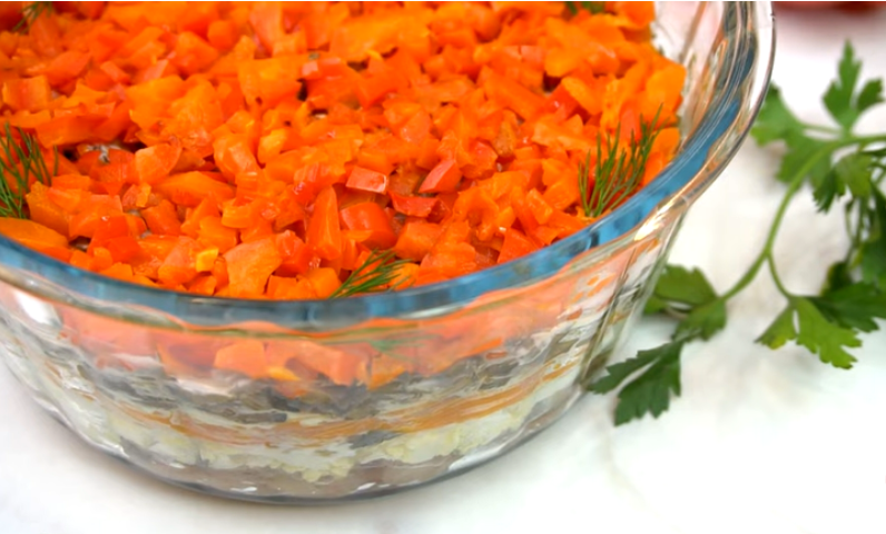 Этот салат станет не только универсальным блюдом для праздника, но и приятным открытием для гостей, которые оценят его изысканный вкус.