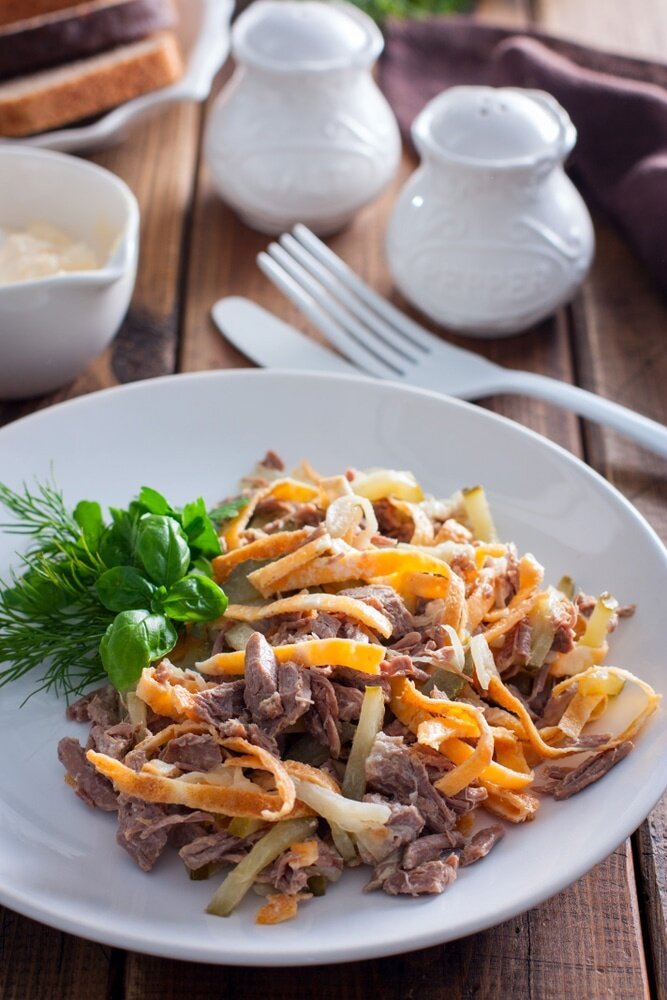 Этот салат — настоящее гастрономическое открытие для всех любителей оригинальных закусок. Сочетание нежной говядины и воздушных яичных блинов создает уникальный вкус, который не оставит равнодушным.