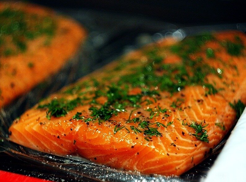 Подготовленный укроп необходимо оставить в виде мелких веточек — так он лучше ароматизирует рыбу. Приступайте к натиранию: равномерно распределите смесь соли и сахара по мясной стороне филейной части, не забывая про внутреннюю часть, куда закладывают зелень. Накройте вторым куском лосося, кожу наружу и положите в стеклянную или керамическую емкость на немного соли и сахара, сообщает Дзен-канал "В саду у Валентинки".