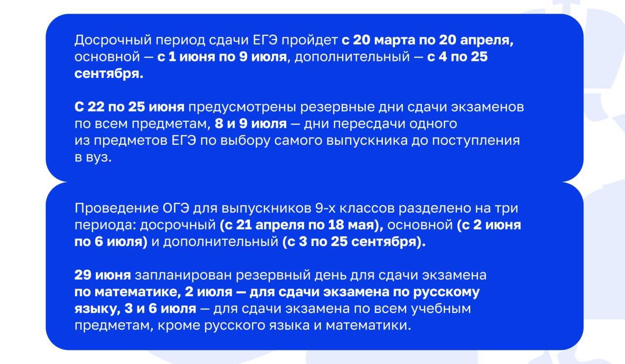 Что касается ЕГЭ, то досрочный период пройдёт с 20 марта по 20 апреля, основной — с 1 июня по 9 июля, а дополнительный — с 4 по 25 сентября.