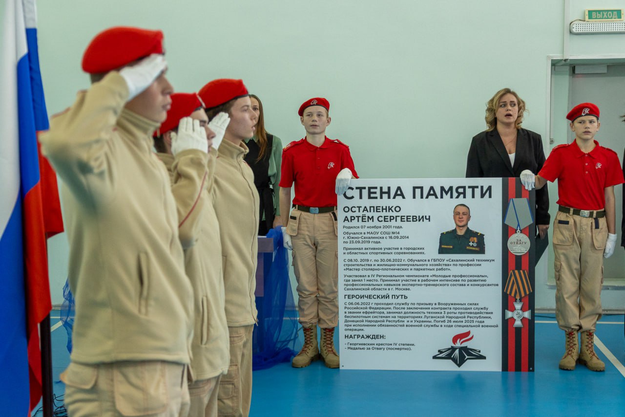 Юнармейскому отряду «Искра» южно-сахалинской школы №14 присвоили имя выпускника Артема Остапенко, погибшего на фронте в ходе СВО. Торжественная церемония состоялась в стенах общеобразовательного учреждения накануне Дня героев Отечества.