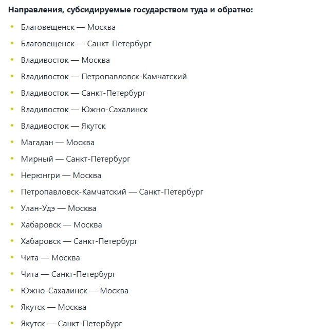 Программа охватывает 68 направлений, в том числе рейсы из Владивостока, Хабаровска, Южно-Сахалинска, Петропавловска-Камчатского и других городов в Москву, Санкт-Петербург, Сочи и обратно. Также доступны перелеты между дальневосточными и сибирскими городами.