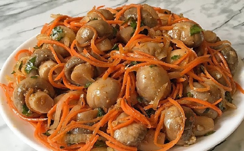 Наконец, горячие шампиньоны соединяются с овощами, аккуратно перемешиваются. Чтобы закуска приобрела насыщенный вкус, нужно оставить её на полчаса при комнатной температуре — это позволит всем ингредиентам слиться воедино. Можно также поставить в холодильник, чтобы усилить вкус.