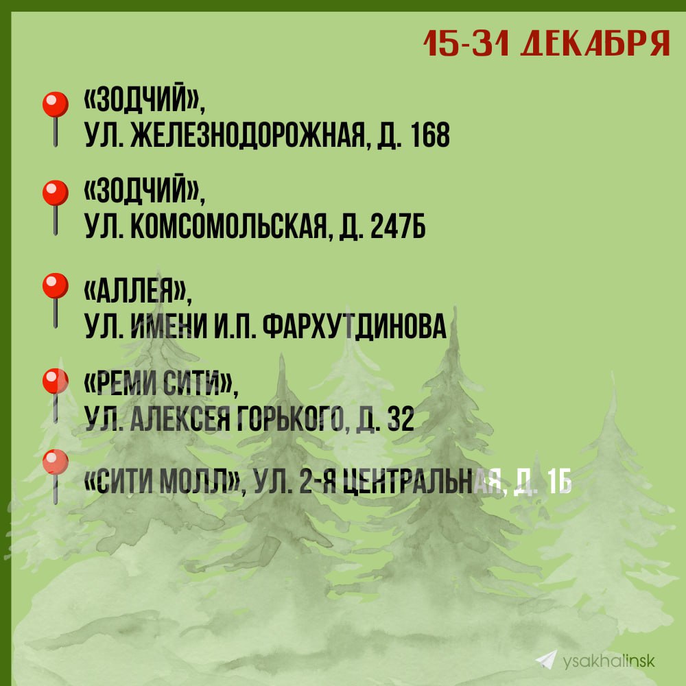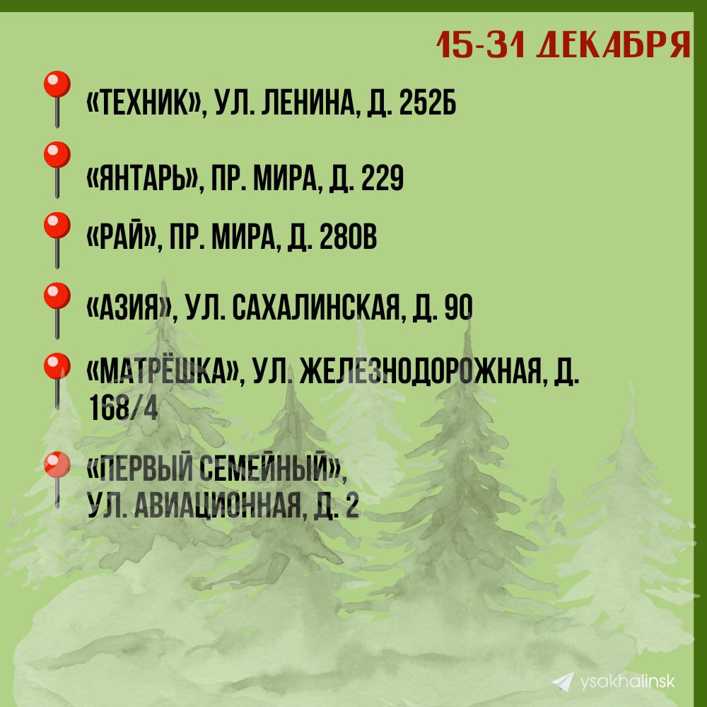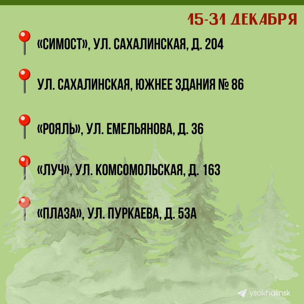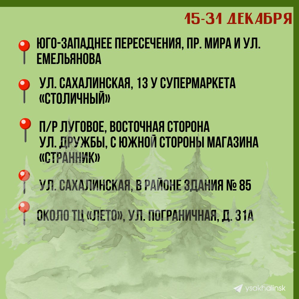 Чтобы вы легко нашли свою «зелёную красавицу», предлагаем воспользоваться списком с адресами ёлочных базаров от мэрии Южно-Сахалинска @ysakhalinsk