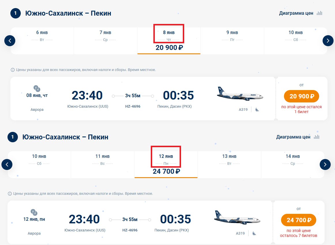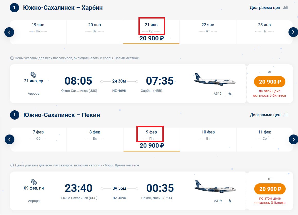 на официальном сайте авиакомпании «Аврора» — на рейсы из Южно-Сахалинска в Пекин и Харбин;