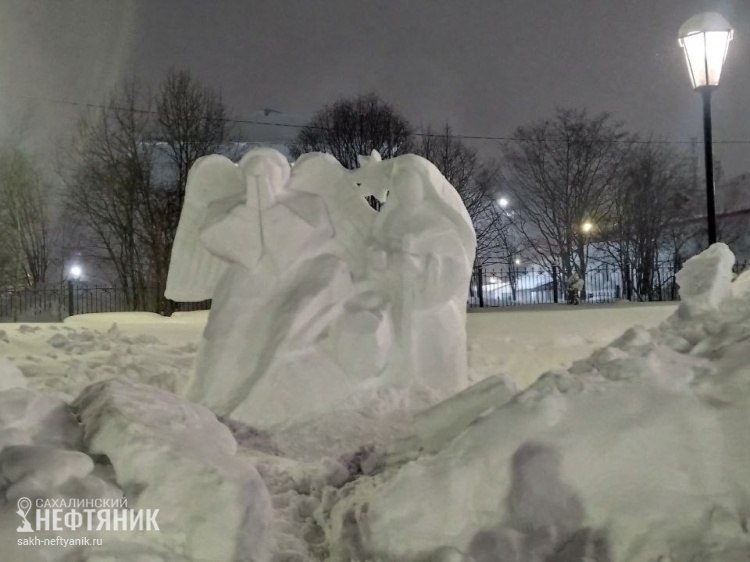 Крылья ангела укрыли Оху – у православного прихода появилась снежная композиция