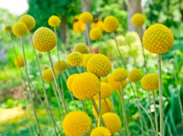 - Краспедия шаровидная (Craspedia globosa): самую известную часть этого растения, которая достигает 30 см в высоту и гордо распускает соцветия диаметром до 3,5 см.