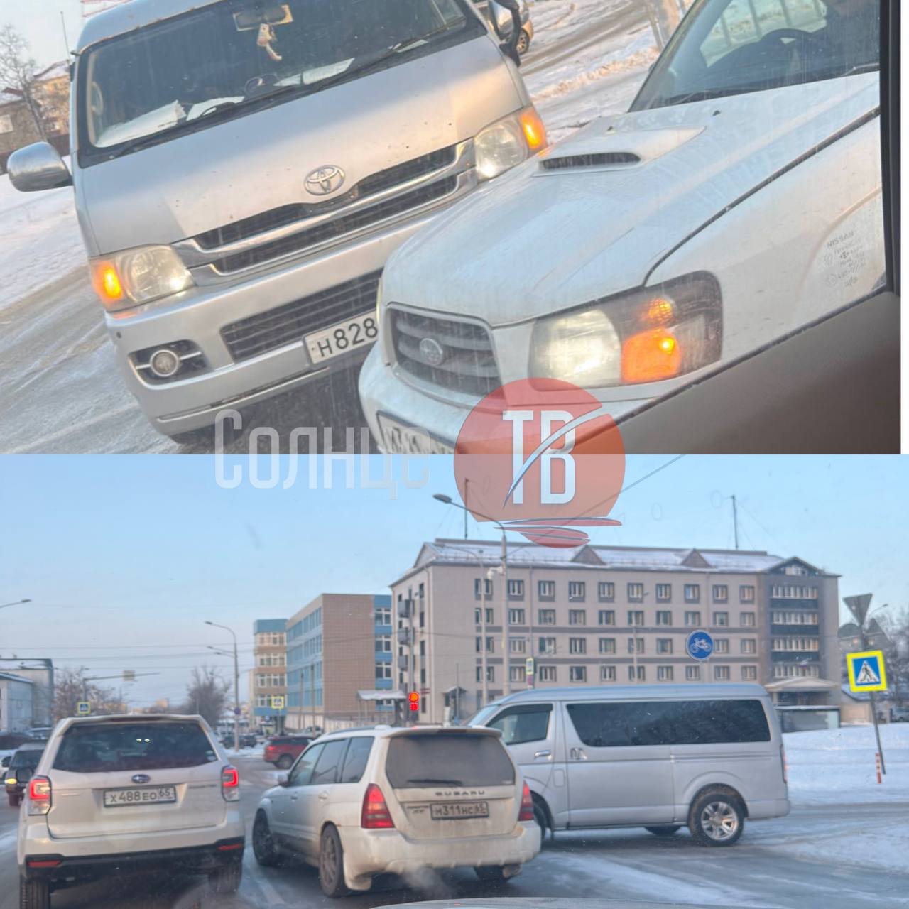 В пятницу утром на улице Смирнова проезжую часть не поделили "Toyota Hiace" и "Subaru".