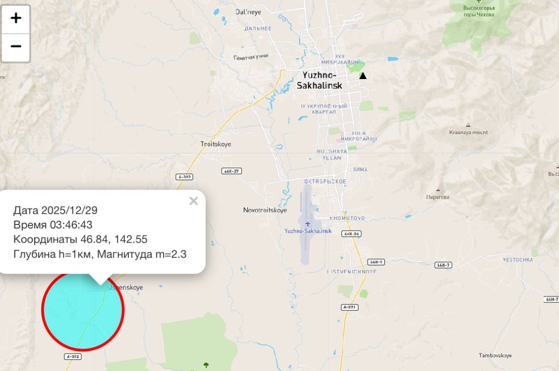 По данным eqalert, слабый толчок силой до 2-3 баллов зафиксирован в Успенском и соседних селах. Отголоски дошли до Южно-Сахалинска.