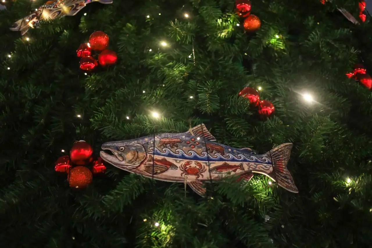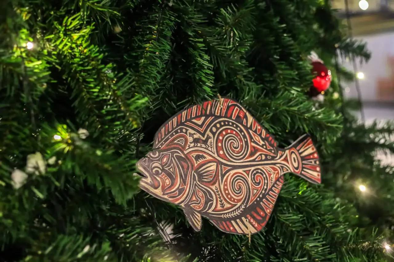 Главная ёлка оформлена в оригинальном стиле: её украшают игрушки в виде рыб, на которых изображены пейзажи острова, силуэты рыбаков и обитатели морских глубин. Дополняют композицию несколько маленьких ёлок, установленных рядом.