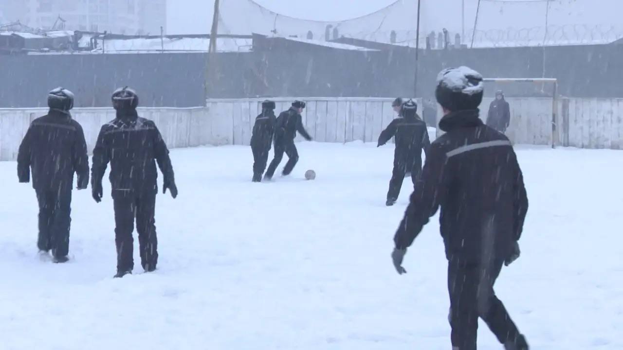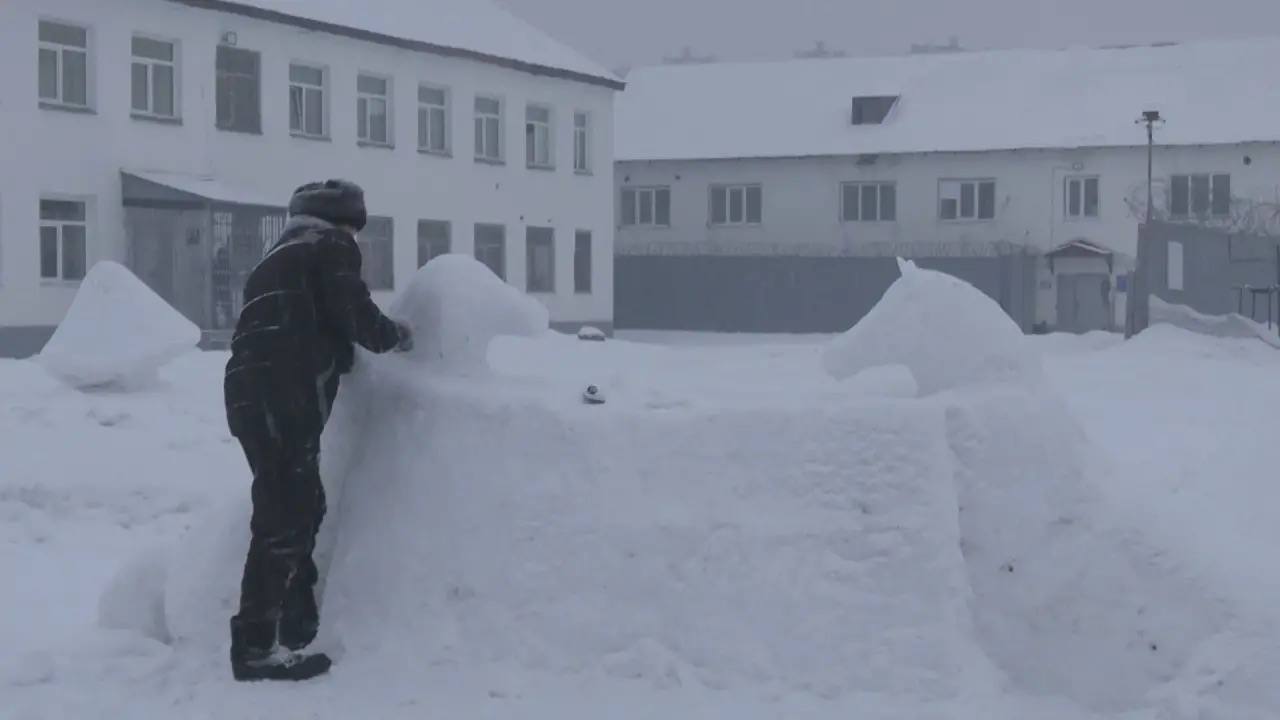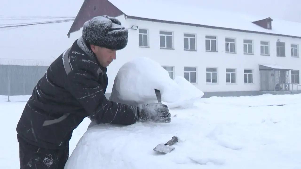 Двухметровую скульптуру огненной лошади создают из снега осуждённые исправительной колонии № 2.