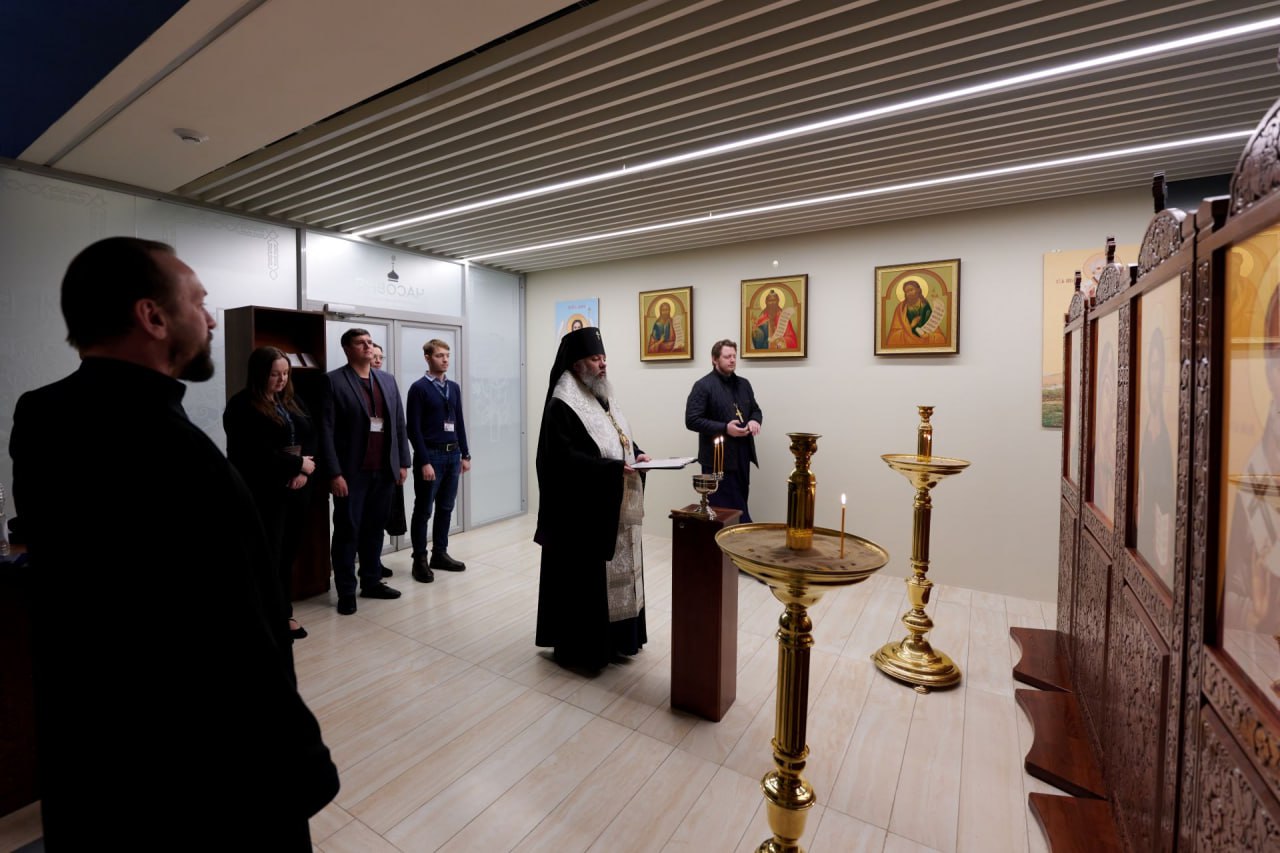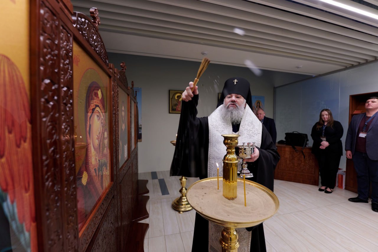 Полноценный зал, где верующие могли бы уединиться и мысленно обратиться к Богу, в воздушной гавани открыли год назад. Тогда в часовне временно разместили офисную мебель. Сейчас же её заменили церковной. На отдельных элементах нанесены особые узоры — символы, значимые для православных христиан.