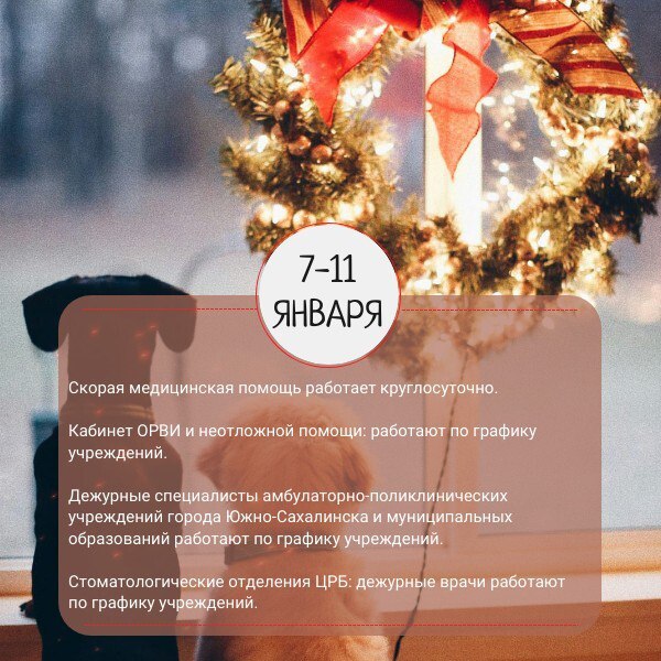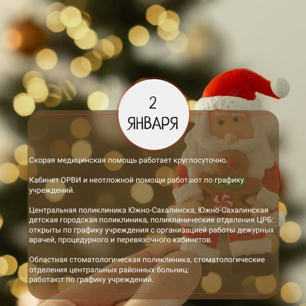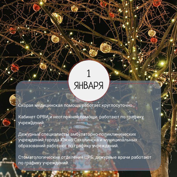 Минздрав Сахалинской области информирует жителей островного региона об изменении в работе медицинский учреждений в новогодние каникулы. Подробности — в карточках от @minzdrav_sakh.