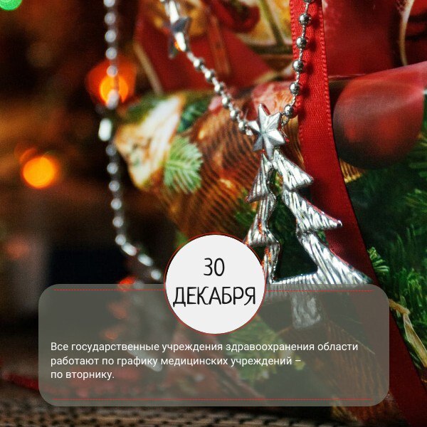30 декабря все государственные учреждения здравоохранения будут работать по графику медицинских учреждений — по вторнику, с 12 января — в обычном режиме.
