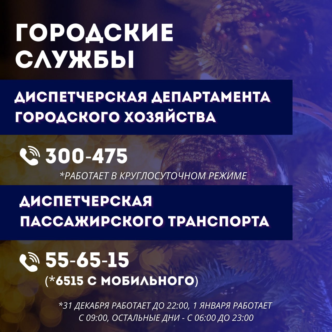 Напомню, что диспетчерские службы на новогодних каникулах будут работать в круглосуточном режиме. Единственное, узнать информацию по общественному транспорту можно с 6 до 23 часов (с особым режимом 31 декабря и 1 января).Обязательно сохраните себе!