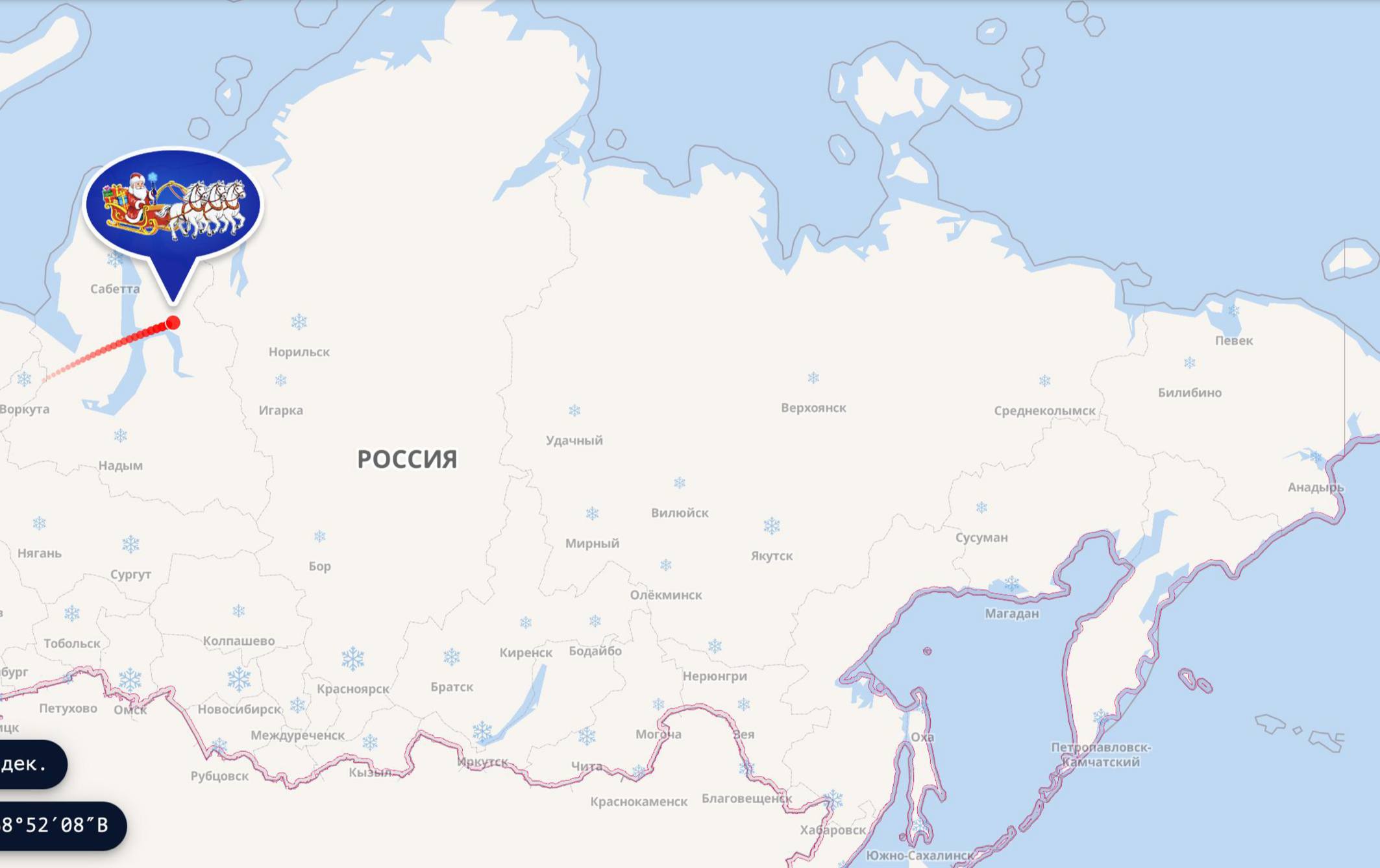 Кстати, сейчас сани дедушки летят над Сибирью, в сторону Норильска.
