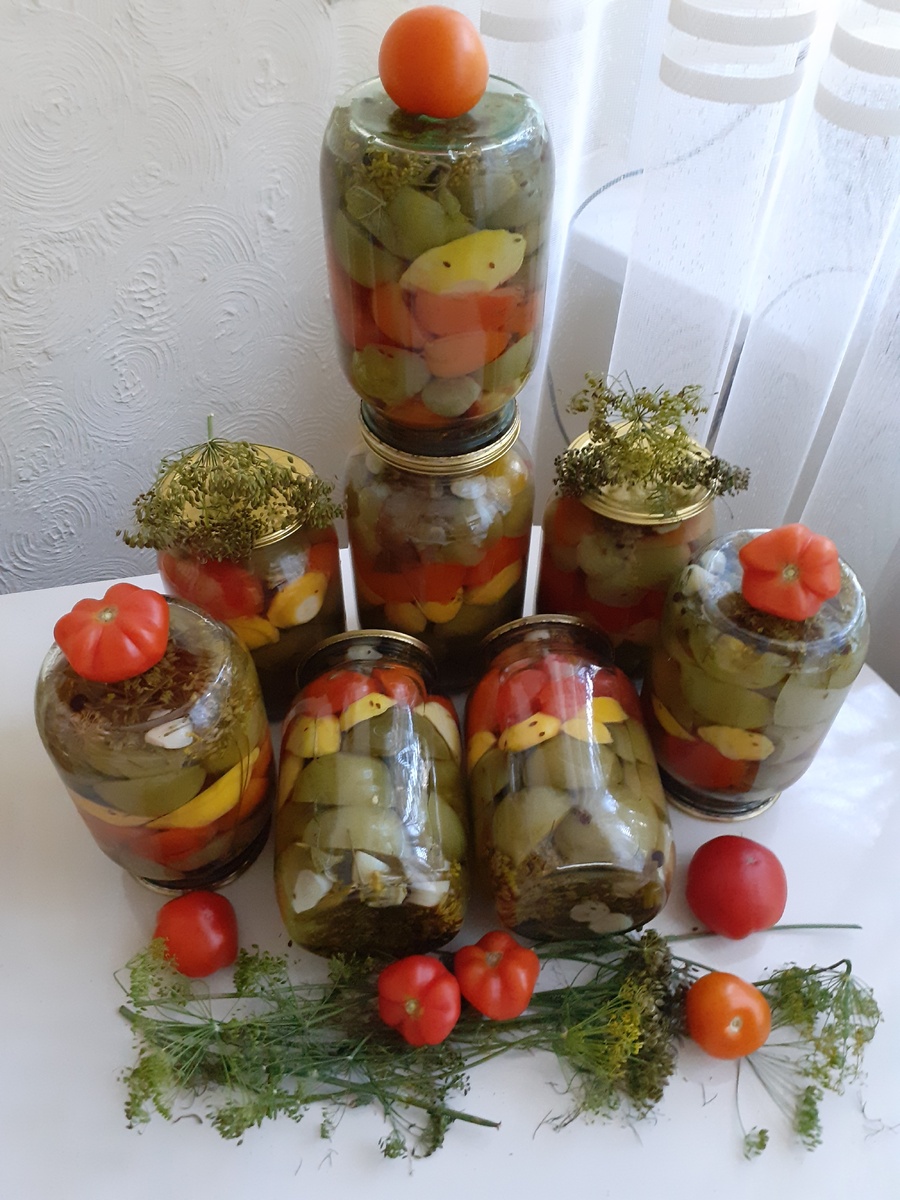 Банки на 1 литр предварительно стираются и стерилизуются в духовке на 130°C в течение 10 минут. Все дополнительные ингредиенты (травы и листья) бланшируются в кипящей воде 1-2 минуты и раскладываются по банкам. Затем укладывают слоями ассорти: сначала зеленые томаты, затем патиссоны, и сверху красные томаты, предварительно тоже бланшированные.