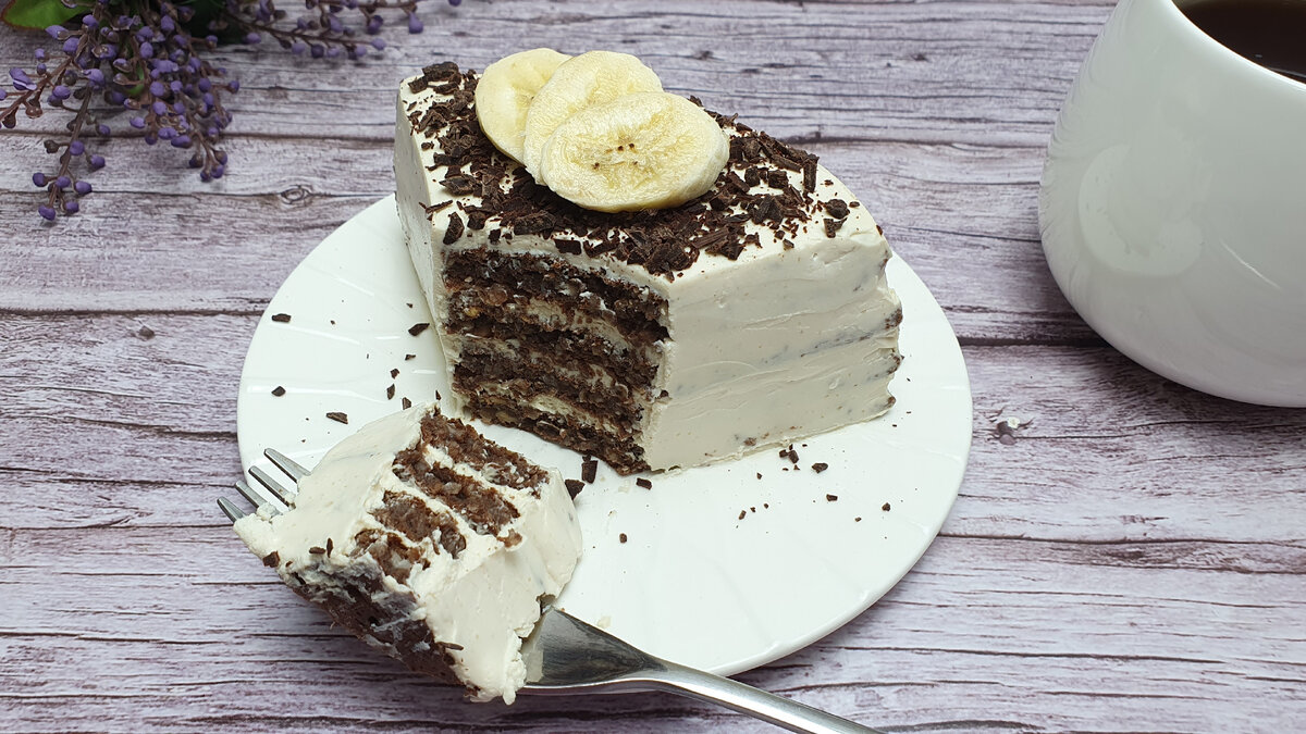 Шаг 3: Сборка торта. На каждый корж нанести крем, чередуя слои. Полностью обмазать верх и бока торта кремом. Для лучшего вкуса охладить десерт в холодильнике на несколько часов, предпочтительно оставить на ночь. В конце украсить поверхность по своему усмотрению, например, посыпать тертым шоколадом и нарезанным бананом.