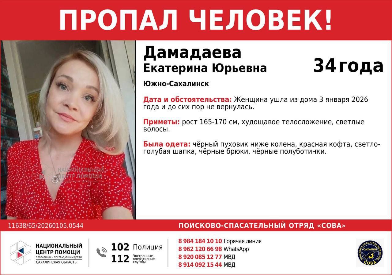 Родственники и полиция областного центра ищут 34-летнюю Екатерину Юрьевну Дамадаеву. Она ушла из дома 3 января и до сих пор не вернулась, сообщает @sakhpsosova.
