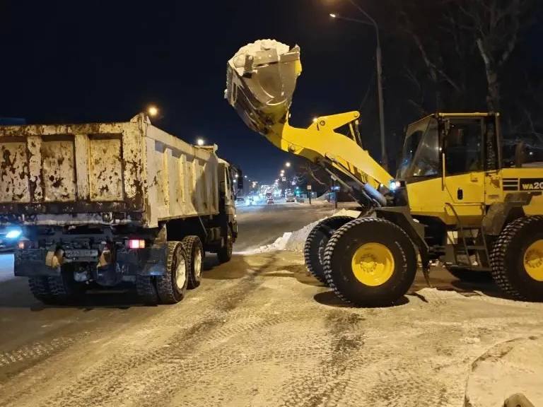 Сегодня днём на улицах города работают 135 единиц техники и 80 рабочих. Снег вывозят с улиц Физкультурной, Горького, Сахалинской, Невельской, Курильской, Комсомольской, Саранской, Тельмана, Холмского шоссе, проспектов Мира и Победы.