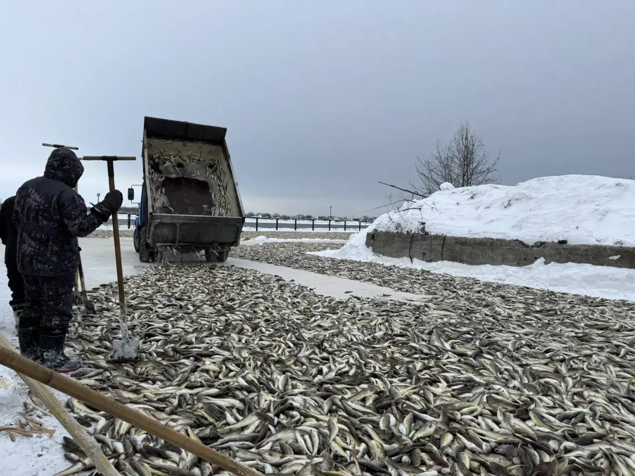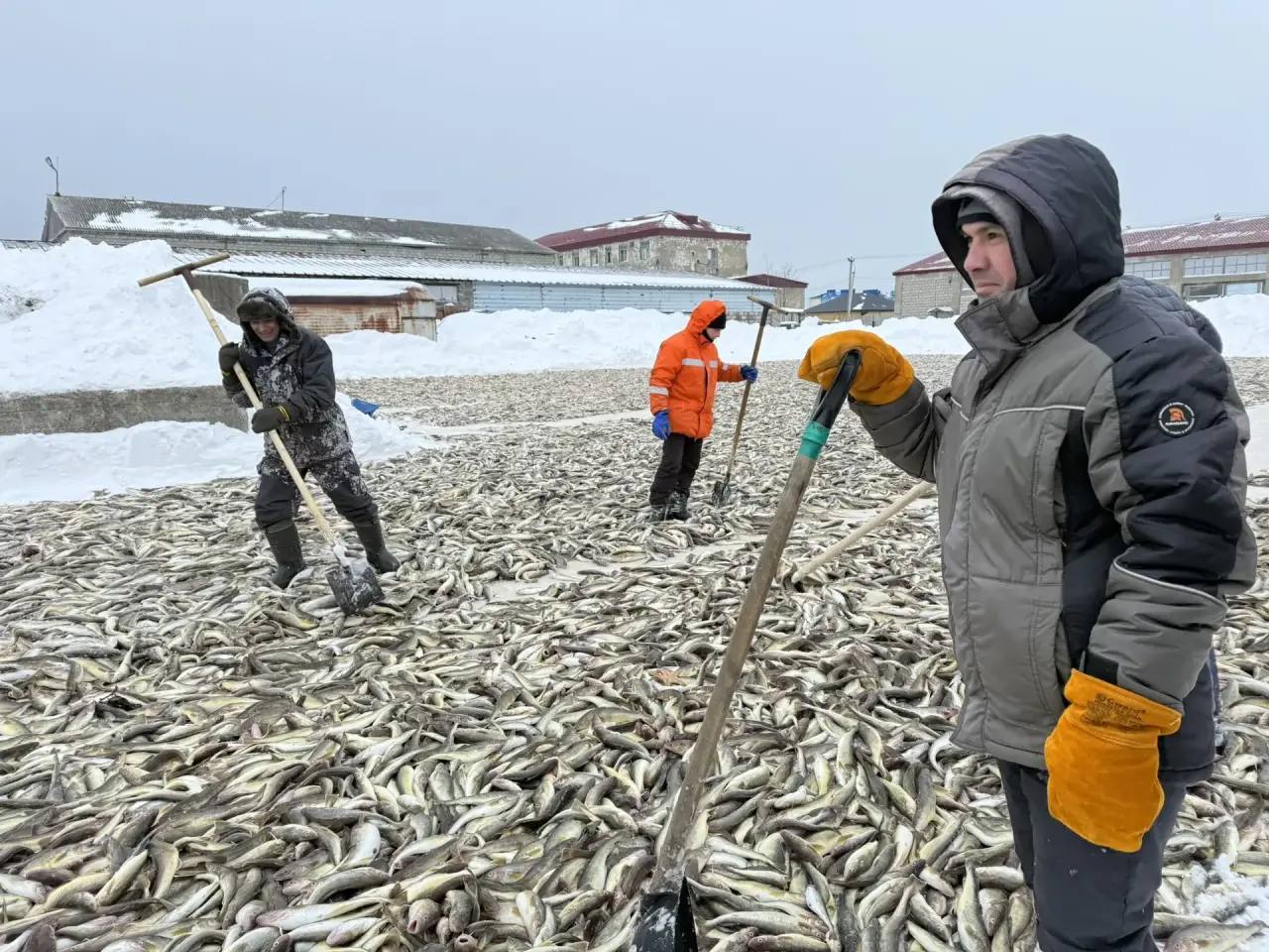 Только один из рыболовецких колхозов на восточном побережье за 2 дня промысла добыл свыше одной тысячи тонн. Здесь рыбу ловят десять промысловых судов. После возвращения из моря они выгружают навагу на заранее подготовленные ледовые подушки, где рыба проходит естественный процесс заморозки. Улов выкладывают тонким, равномерным слоем. Кроме того, рыбу постоянно ворошат. Это нужно, чтобы она не примерзала ко льду и не слипалась между собой. После - навагу фасуют в мешки и отправляют на островные прилавки.