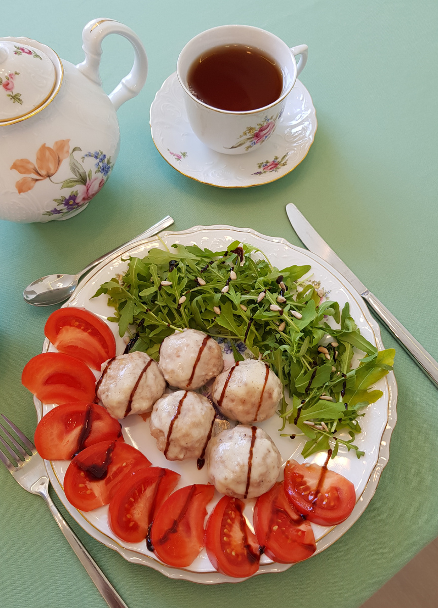 Для завершения необходимо дополнить блюдо свежими помидорами, рукколой, бальзамическим соусом и поджаренными семечками. Удачного вам приготовления!