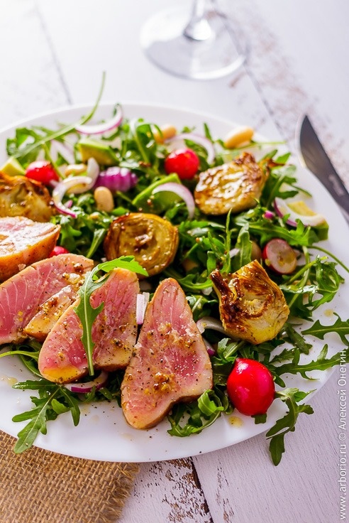 Прежде всего, разморозьте филе тунца, оставив его в холодильнике на ночную разморозку. Затем обжарьте его на гриле или сковороде на сильном огне, не дольше 45 секунд с каждой стороны. Это поможет сохранить нежность внутри. После жарки следует промокнуть тунца бумажными полотенцами, чтобы удалить излишки масла. Далее на сильном огне подрумяньте половинки артишоков до золотистого цвета, после чего их тоже стоит обсушить.