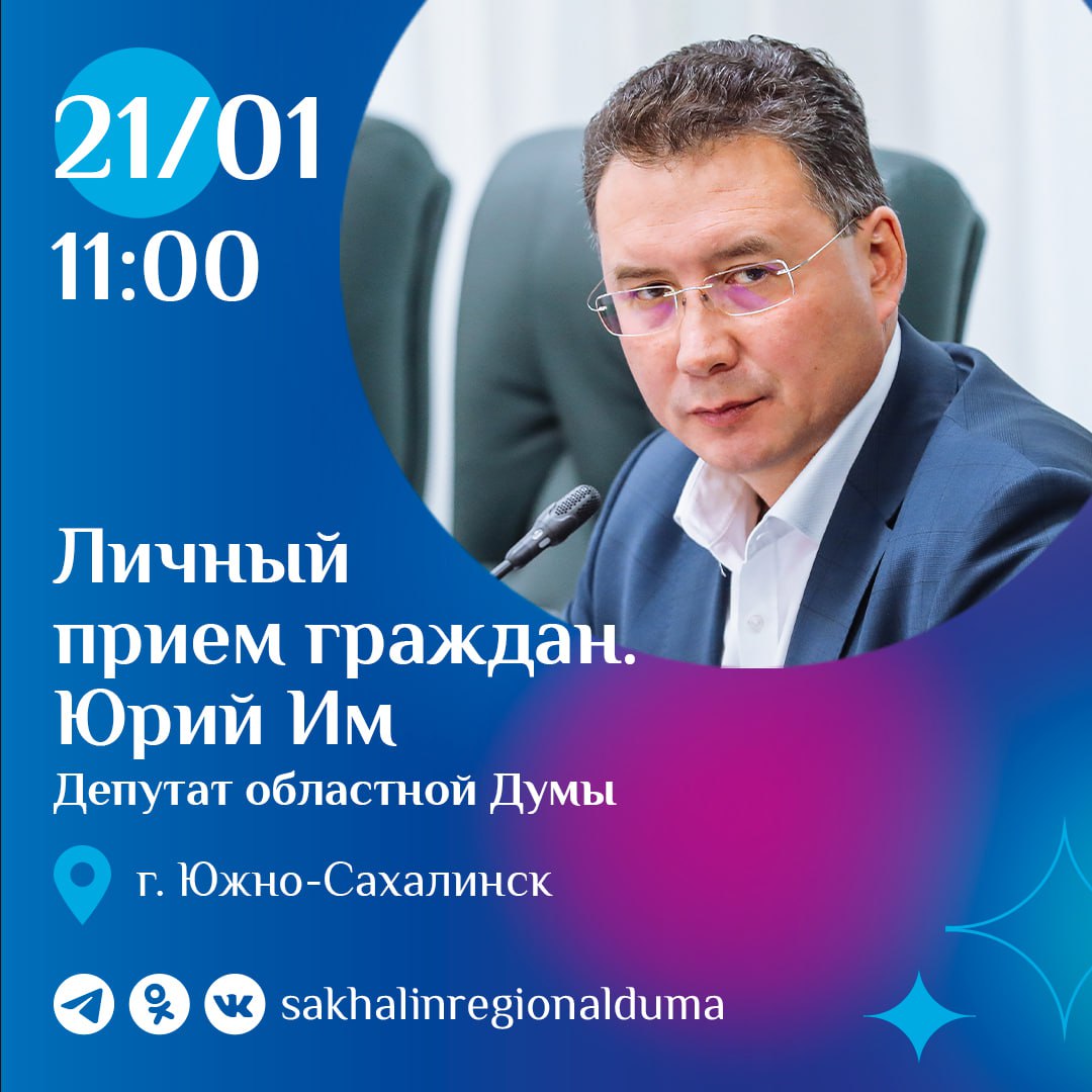 Заместитель председателя постоянного комитета Сахалинской областной Думы по экономическому развитию Юрий Им проведет личный прием граждан. Прием пройдет 21 января, с 11:00 в Сахалинской областной Думе по адресу: город Южно-Сахалинск, улица Чехова, 37.