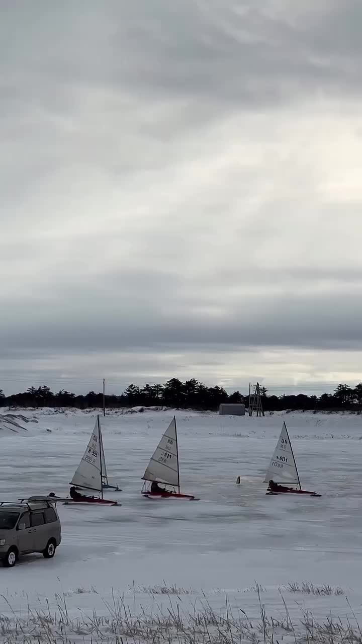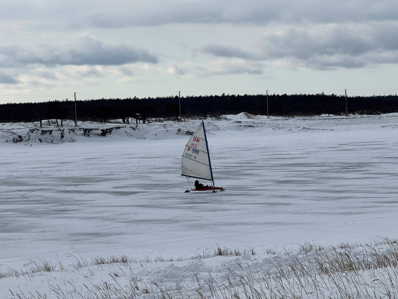 Вчера за Охотским удалось случайно понаблюдать за тренировками гонщиков на буерах. Буер - легкая парусная конструкция на коньках для скольжения по льду.