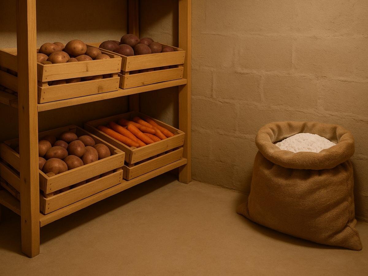 Действие негашеной извести основано на её способности поглощать влагу. Материал вступает в реакцию с водой, постепенно превращаясь в гашеную известь, что делает воздух в погребе суше. Это предотвращает образование конденсата на стенах и ящиках, что особенно важно для хранения корнеплодов и других овощей, требующих стабильной температуры и низкой влажности.