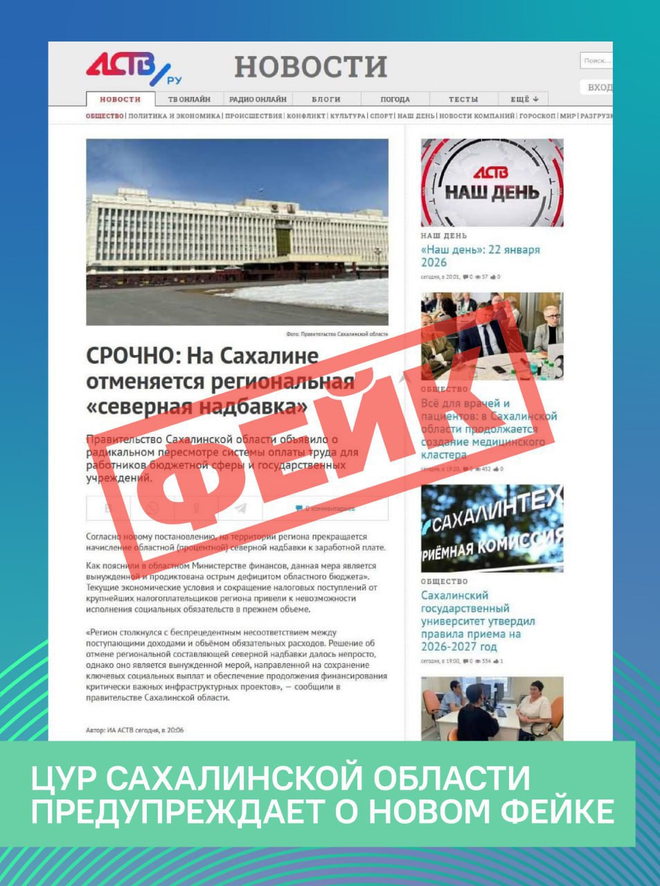 По островным соцсетям "летает" недостоверная информация об отмене северной надбавки в Сахалинской области. Для распространения слуха злоумышленники подделали страницу сайта astv.ru.