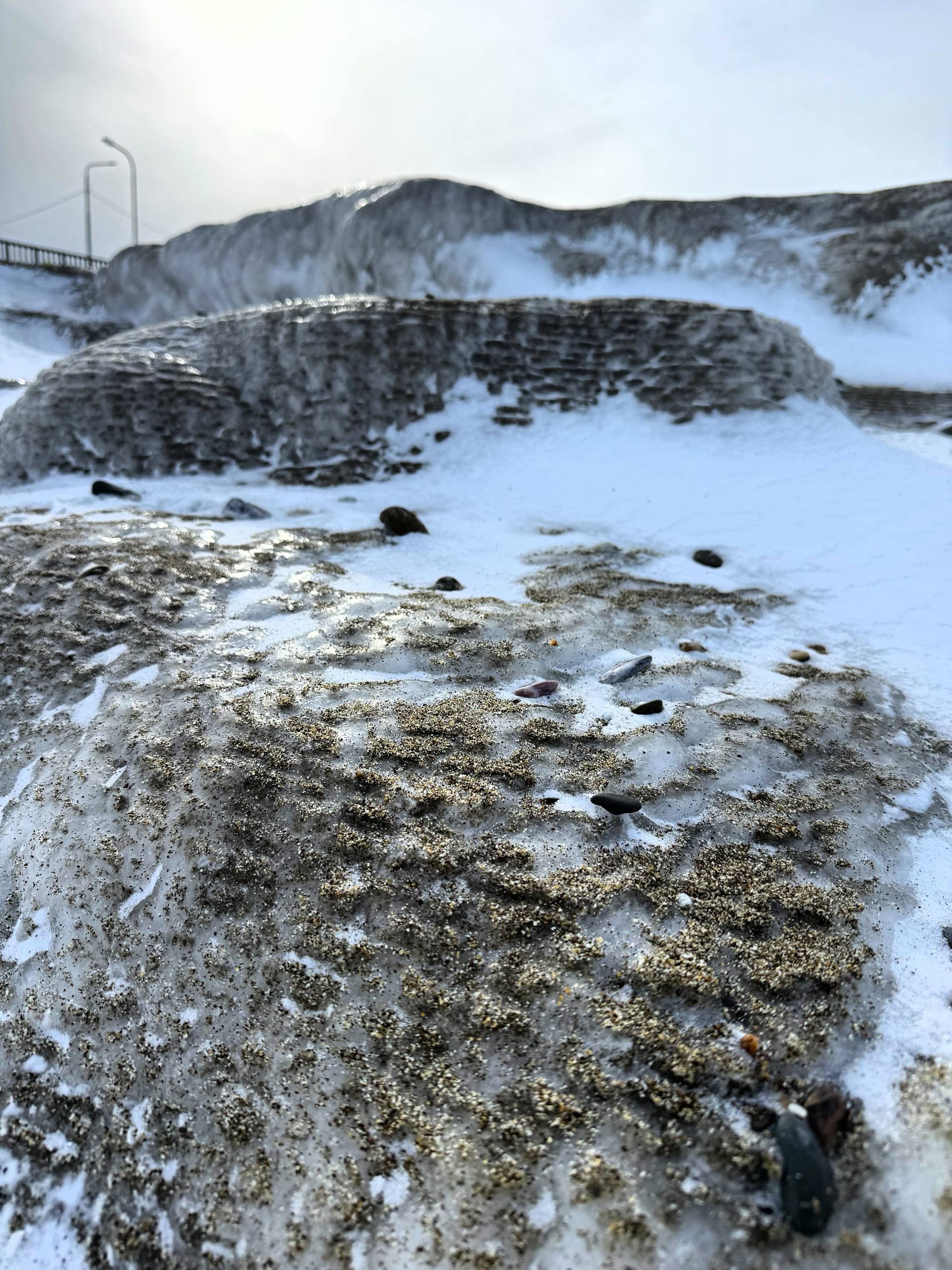 Сахалинская зима творит магию: вместо шума прибоя — тишина и причудливые узоры на берегу.