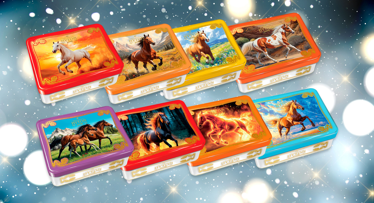 В год, когда циркулирует образ Лошади, коллекции с праздничной символикой получают дополнительную теплоту восприятия. Например, декоративные жестяные коробки с зимним дизайном и домиком выглядят празднично и подходят для близких и коллег.