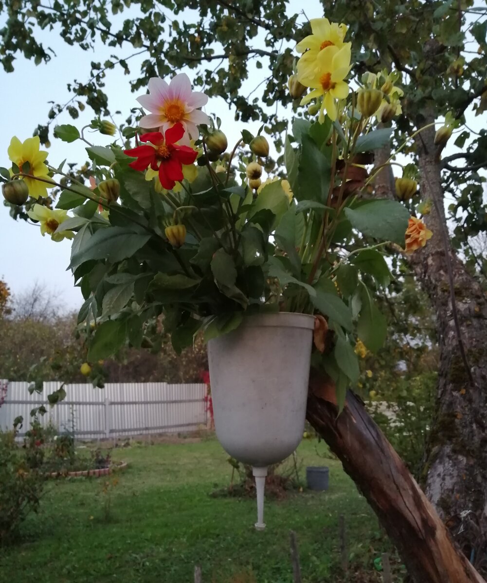 Срезанные однолетние георгины, оказавшиеся на старом рукомойнике, словно напоминают о лете, добавляя в осенний пейзаж теплоту и лёгкость. Такие букеты ярко играют на столе, даже если время для чаепития ограничено.