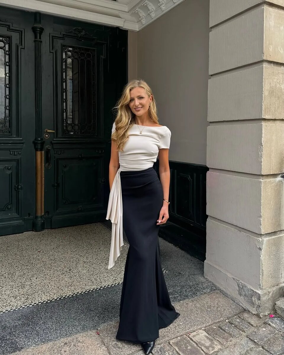 Платье, выполненное из эластичного крепа, имело элегантный белый лиф и переходило в чёрную юбку-русалку, вызывая ассоциации с тем гламуром, который продемонстрировала принцесса Уэльская на премьере «Топ Ган: Мэверик» в 2022 году. Бенедикта, безусловно, смогла повторить эту магию.