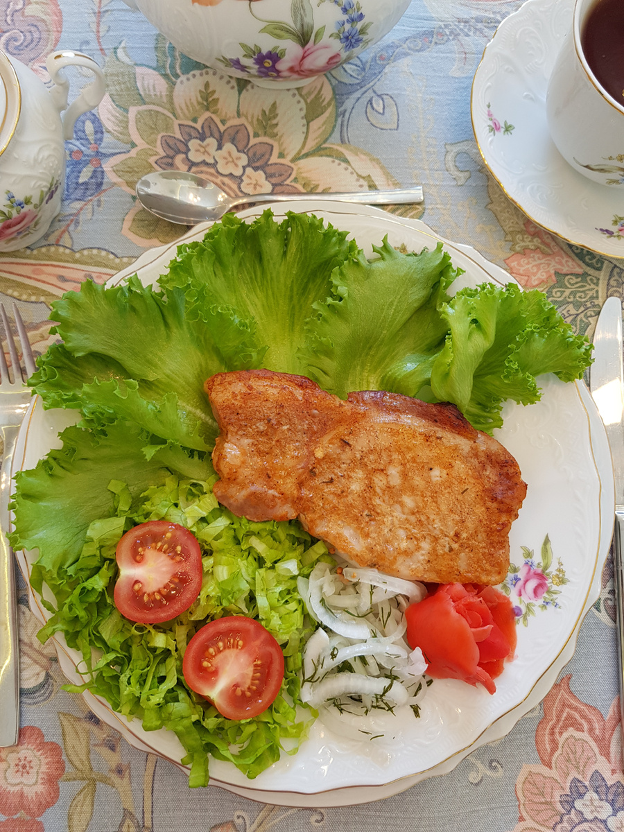 Для подачи нарезать листья салата и помидоры, выложить на тарелку вместе с маринованным луком и запечённой свининой. Приятного аппетита!