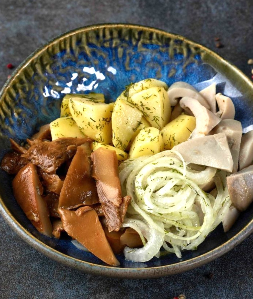 - Салат по-монастырски с грибами: Солёные лесные грибы смешиваются с печёной картошкой, красным луком и свежим укропом, заправляются ароматным растительным маслом. В самые строгие дни вместо масла салат можно заправить рассолом от грибов для насыщенного вкуса.