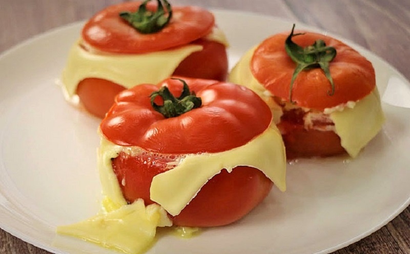 Не забудьте про сыр! Его можно выбрать любой на ваш вкус: твердый, плавленый или моцареллу. Нарежьте сыр или натрите, выложив сверху на начинку. В микроволновке сыр расплавится, создавая аппетитную корочку и придавая блюду кремовость. Накройте помидоры срезанными «крышками» — они защитят начинку и сохранят ароматы.