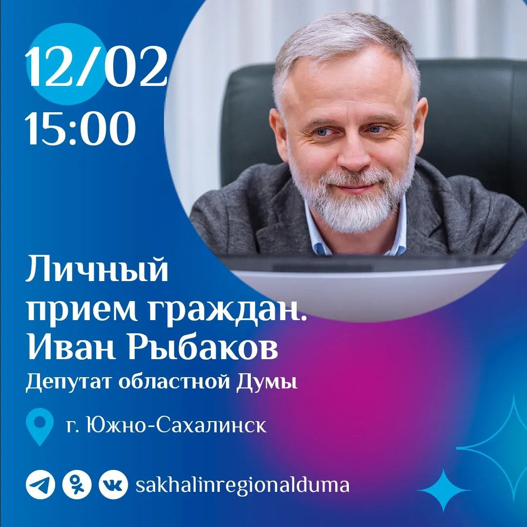 Депутат Сахалинской областной Думы Иван (https://t.me/nashsakhalin) Рыбаков проведет личный прием граждан. Прием пройдет завтра, 12 февраля, с 15:00 в региональном парламенте по адресу: город Южно-Сахалинск, улица Чехова, 37.