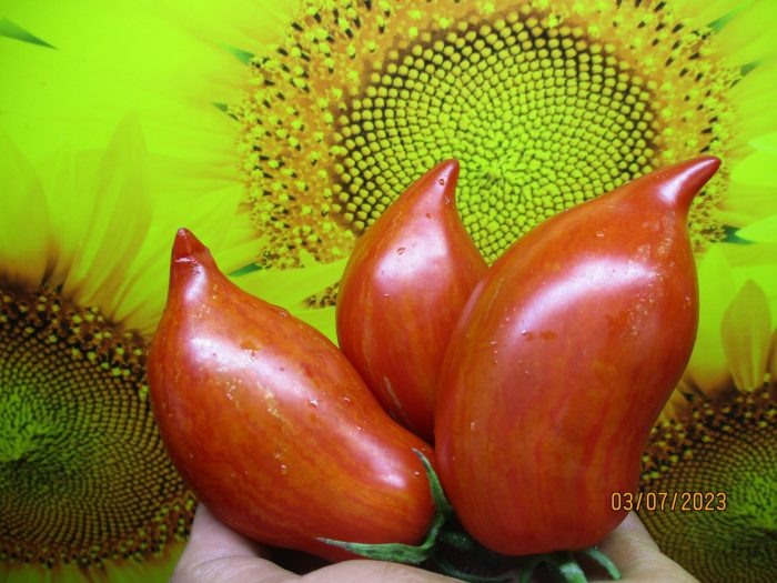 Плоды сорта представляют собой красочные «сливки» с плотной, мясистой мякотью. Их уникальная окраска формируется благодаря пигментам: на зеленом фоне появляются яркие полосы и штрихи оранжевого и желтого цветов. Интенсивность окраски зависит от солнечного света, поэтому для достижения максимальной выраженности плоды следует выращивать в хорошо освещенных местах.