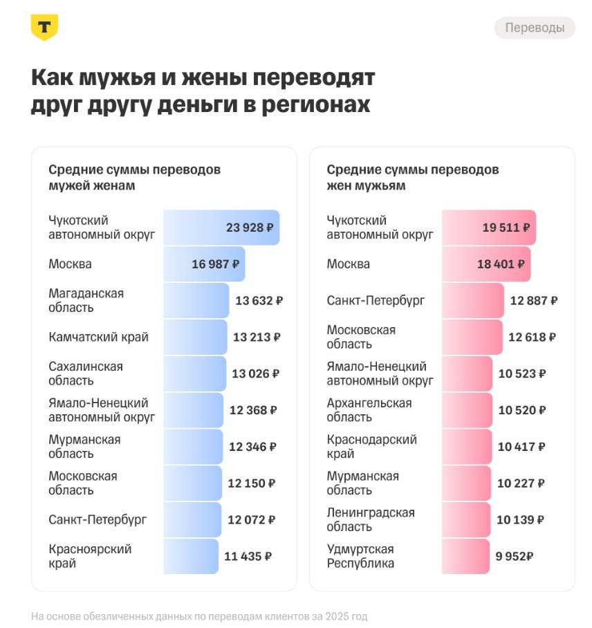По данным банка, в среднем по стране мужья переводят женам 10 548 рублей за одну транзакцию, а жены мужьям — 10 265 рублей. Самым крупным переводом 2025 года стал платеж мужа супруге на 30,85 млн рублей — с романтической открыткой.