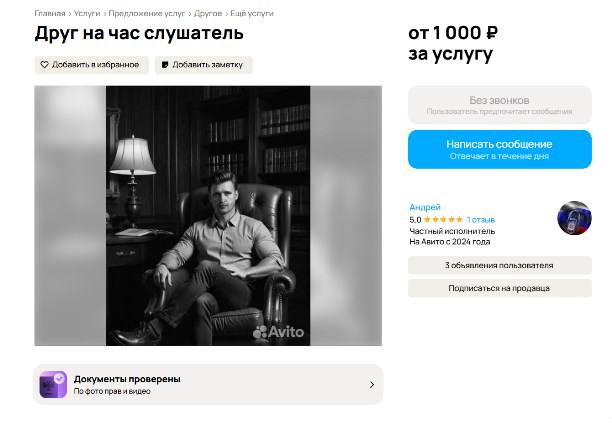 Отдельная категория объявлений — "друг на час" или собеседник. Авторы готовы выслушать без осуждения, обсудить личные проблемы, кризисы в отношениях, переживания после расставания или просто поговорить "по душам". Общение — конфиденциальное, в формате переписки или голосовых сообщений.