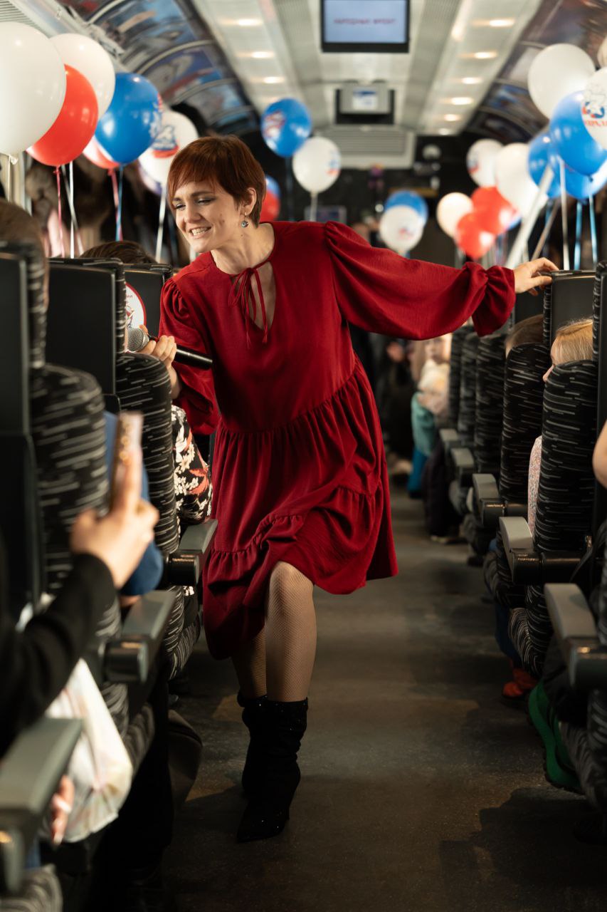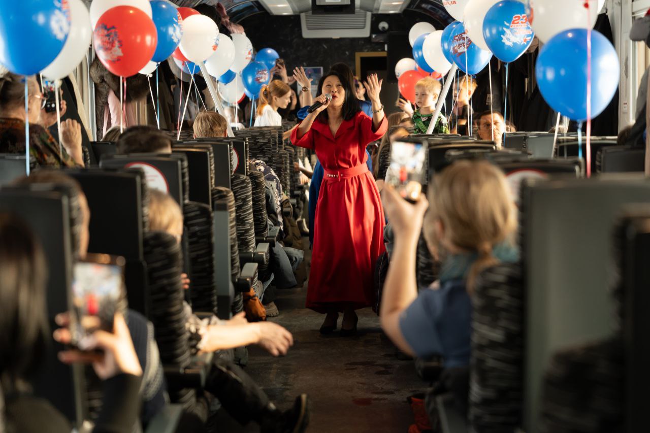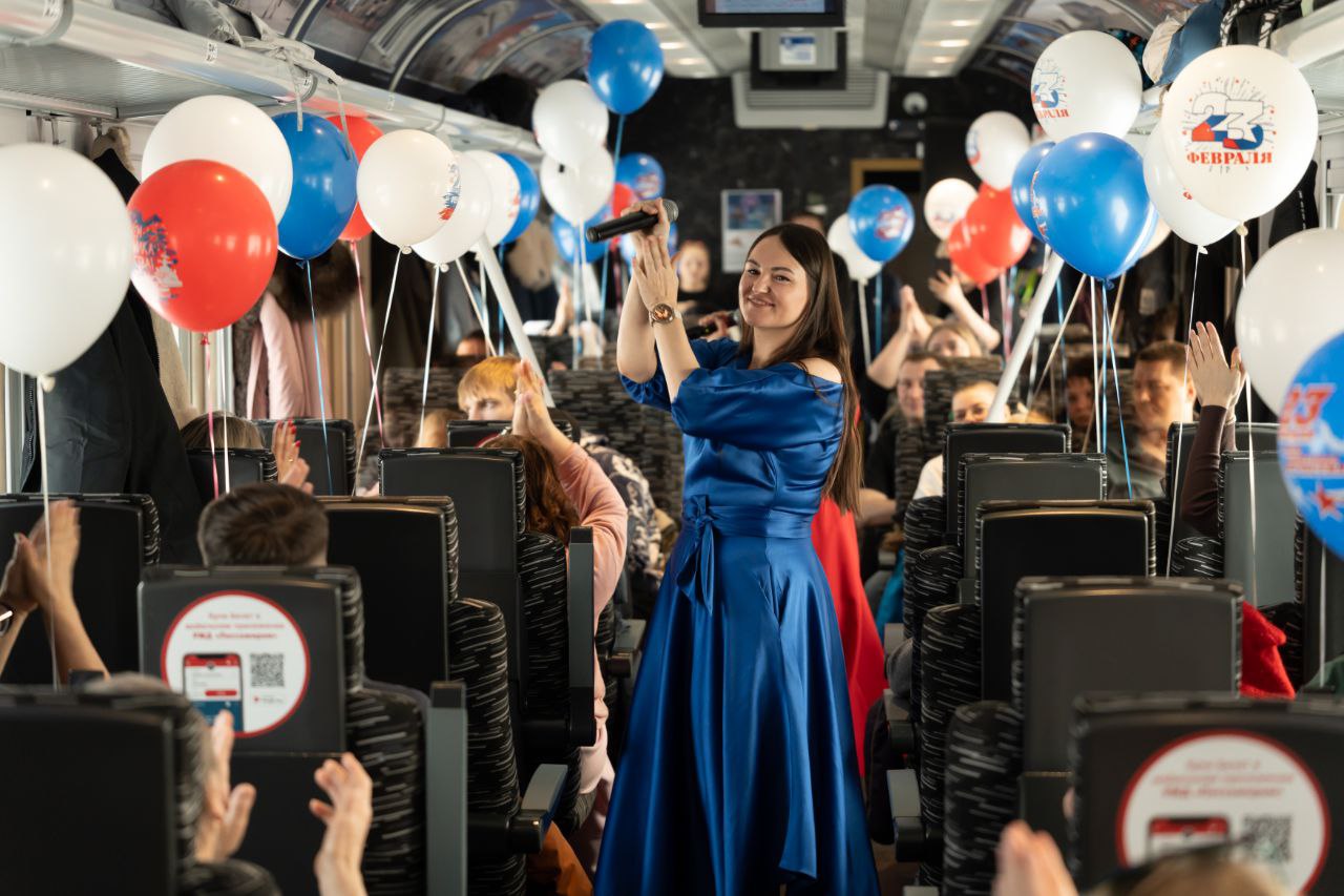 Первый вагон превратился в настоящую концертную площадку, где звучали проникновенные мелодии, посвященные мужчинам и защитникам Родины. Артисты Союза деятелей эстрадного искусства подарили пассажирам незабываемые музыкальные номера, которые тронули самые тонкие струны души.