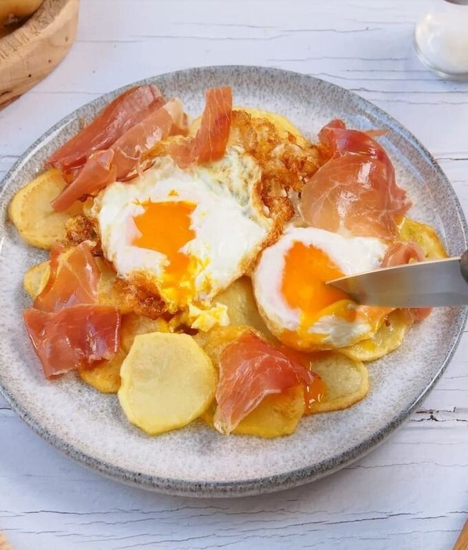 На дно тарелки первым слоем выложить жареный картофель, затем сверху разместить яичницу, а сверху равномерно распределить тонко нарезанную ветчину. Яичница с картофелем и ветчиной готова к подаче. Этот завтрак станет настоящим украшением вашего стола! Если жареный картофель не по душе, можно отварить его, затем охладить и нарезать, а после положить на сковороду для дальнейшего приготовления, сообщает Дзен-канал "Рецепты на каждый день".